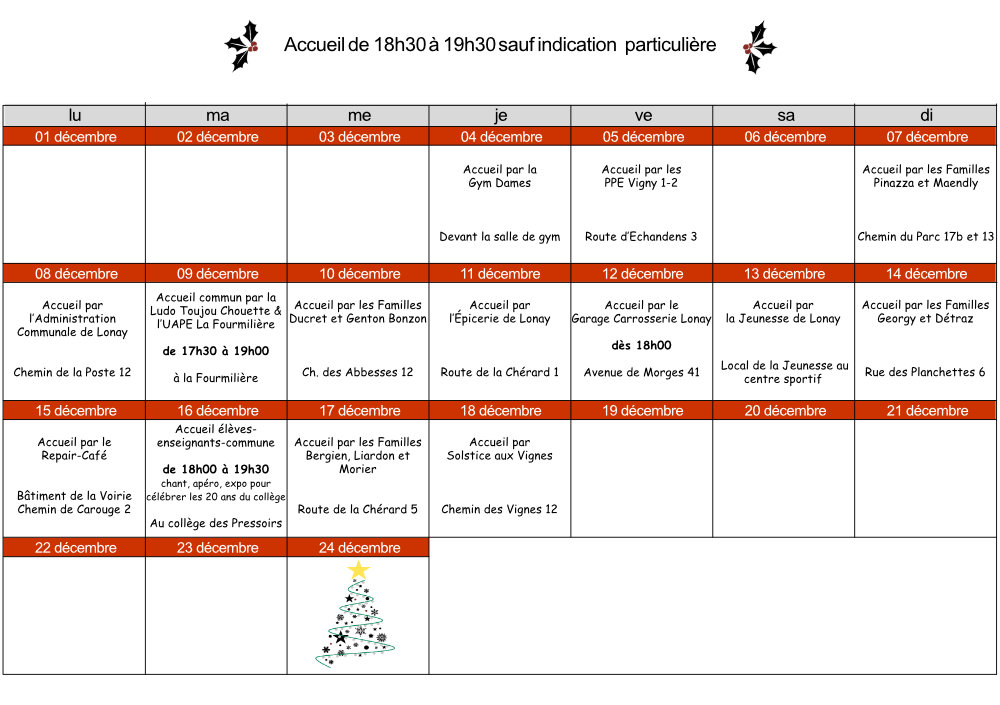 Délai pour l’inscription : vendredi 7 novembre 2025. Le planning final des fenêtres vous parviendra lors d’un tout-ménage et sera affiché aux panneaux communaux, à l’administration communale, au centre paroissial, à l’épicerie et au tea-room. Il sera également visible sur notre site et sur celui de la commune de Lonay, sur Facebook et Instagram. Nous nous réjouissons de vous voir nombreux en décembre !
